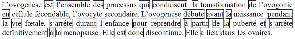 La première partie de l’activité consistait à demander aux étudiants de reconstituer la définition d’un terme de médecine (l’ovogenèse) en s’appuyant sur une liste de mots-clés contenus dans la définition de ce terme mais présentés dans un ordre différent de celui de leur apparition dans la même définition. Ainsi, les étudiants étaient invités à employer les termes suivants : cellule fécondable ; discontinue ; fœtale ; l’enfance ; l’ovocyte secondaire ; l’ovogenèse ; ménopause ; naissance ; ovaires ; processus ; puberté ; transformation d’ovogonie.
