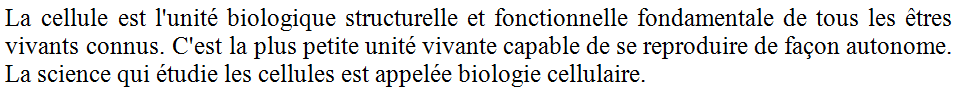 L’activité proposée aux étudiants du troisième groupe est une variante de l’activité auparavant proposée aux étudiants du groupe précédent. Au lieu de travailler sur un texte de plusieurs paragraphes portant sur le changement climatique, la longueur de ce texte a été réduite et une activité supplémentaire a été rajoutée, qui consistait à définir le terme de « cellule », déjà étudié en début d’année dans le cadre du cours de cytologie, et que les étudiants avaient donc eu le temps de maîtriser. L’objectif recherché était de comparer, à travers les évaluations de cette séance par les étudiants, la réception qu’ils feraient de deux activités de consignes et de forme identiques mais portant sur deux types de sujets différents : le premier (« le changement climatique ») relevait de la culture générale, le second (« la cellule ») relevait du programme des études de médecine. Ci-dessous une partie de la définition de la cellule telle que proposée dans cette activité, tirée de Wikipédia :
