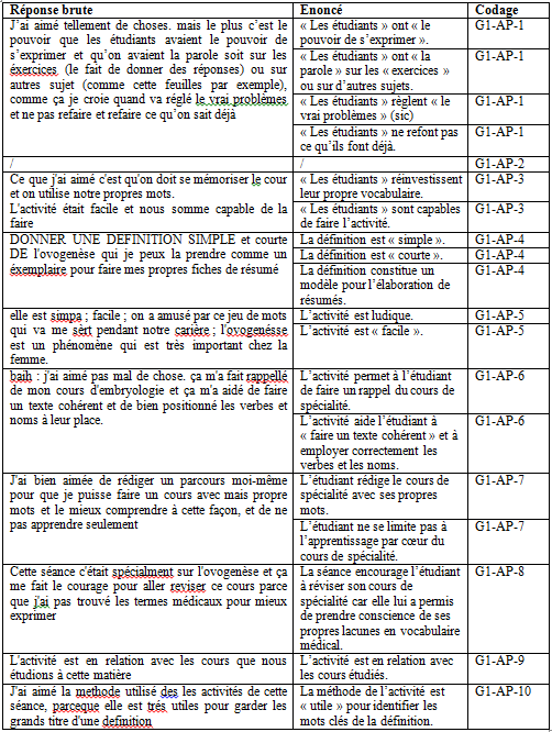 - Codage des réponses relatives aux différentes questions posées à tel groupe (exemple : groupe 1) : G1-AP (appréciations positives) ; G1-AN (appréciations négatives) ; G1-CCM (compréhension du cours de médecine) ; G1-S (suggestions).