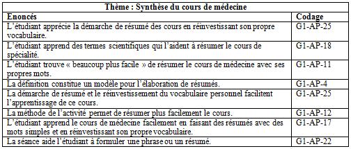 Dans le tableau suivant, sont présentés des exemples de catégorisation d’énoncés ; ces derniers ont été regroupés dans un thème que nous avons intitulé « synthèse du cours de médecine ».