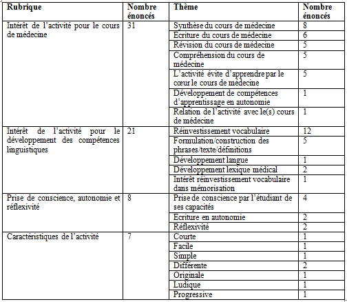 Ainsi, contrairement à l’approche précédente qui consiste à mettre au premier plan la rubrique relative à l’intérêt de l’activité pour le cours de médecine, le thème relatif à l’intérêt de l’activité dans le réinvestissement du vocabulaire personnel apparaît en haut de la liste. Nous avons donc une interprétation des résultats peut-être complémentaire, en tout cas différente. Selon l’approche choisie, l’analyse des besoins peut varier sensiblement ; tantôt on peut penser que les besoins principaux des étudiants consistent à optimiser leur compréhension, synthèse et révision du cours de médecine, tantôt on peut penser que leurs besoins principaux consistent à développer des compétences linguistiques spécifiques, en l’occurrence, en lien avec le réinvestissement de leur vocabulaire personnel.