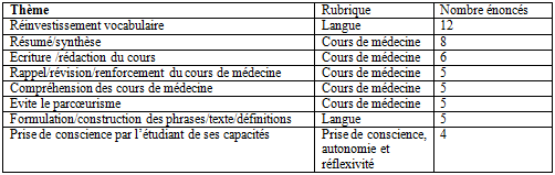 Nous pourrions penser que les besoins principaux des étudiants concernent le cours de médecine, indépendamment du développement de leurs compétences linguistiques. Or, une approche différente, basée sur le classement quantitatif des énoncés selon les thèmes (et non les rubriques) remet en question les résultats de cette analyse.